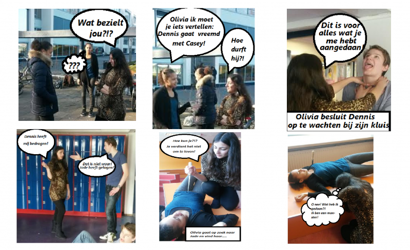 Hierboven is te zien wie wie speelt in het verhaal(voor de duidelijkheid: we hebben alle jongens meisjes gemaakt en andersom), de atributen die we hebben gebruikt en het verhaal voor onszelf in het kort.